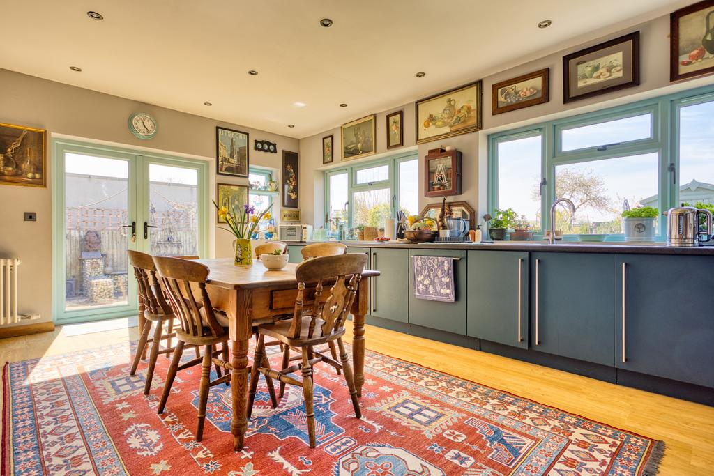 Wooden flooring, column radiator, and fitted units with ample worktops. Equipped with a Stoves gas range cooker, with matching extractor hood, integrated dishwasher, stainless steel sink, and draining board. Double French doors open to the garden, complemented by additional double windows overlooking the grounds. Space remains for a fridge freezer.