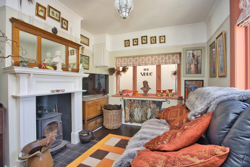 Log-burning fireplace, radiator, and views over the garden. A glazed window to the side adds further natural light.