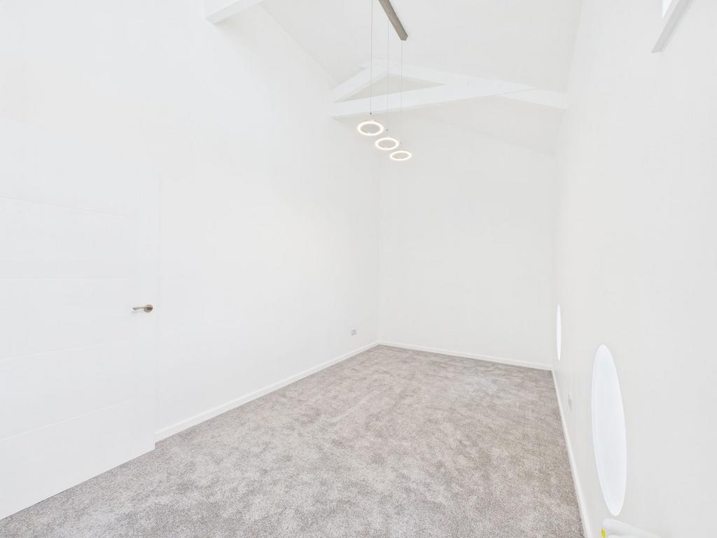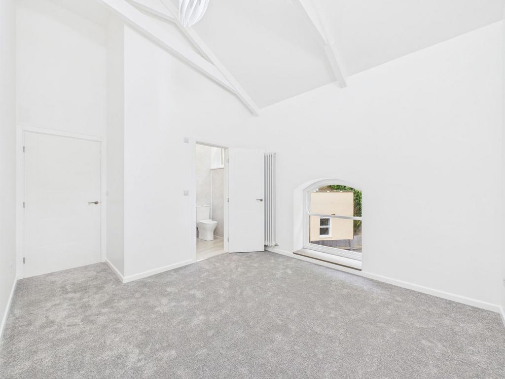 A spacious double room with some charming original features including a double glazed porthole window at high level and arch sash window at floor level which overlooks the garden. There is also the original beam brace to the vaulted ceiling. Ample power points one with usb points. Modern radiator. Door to:-
