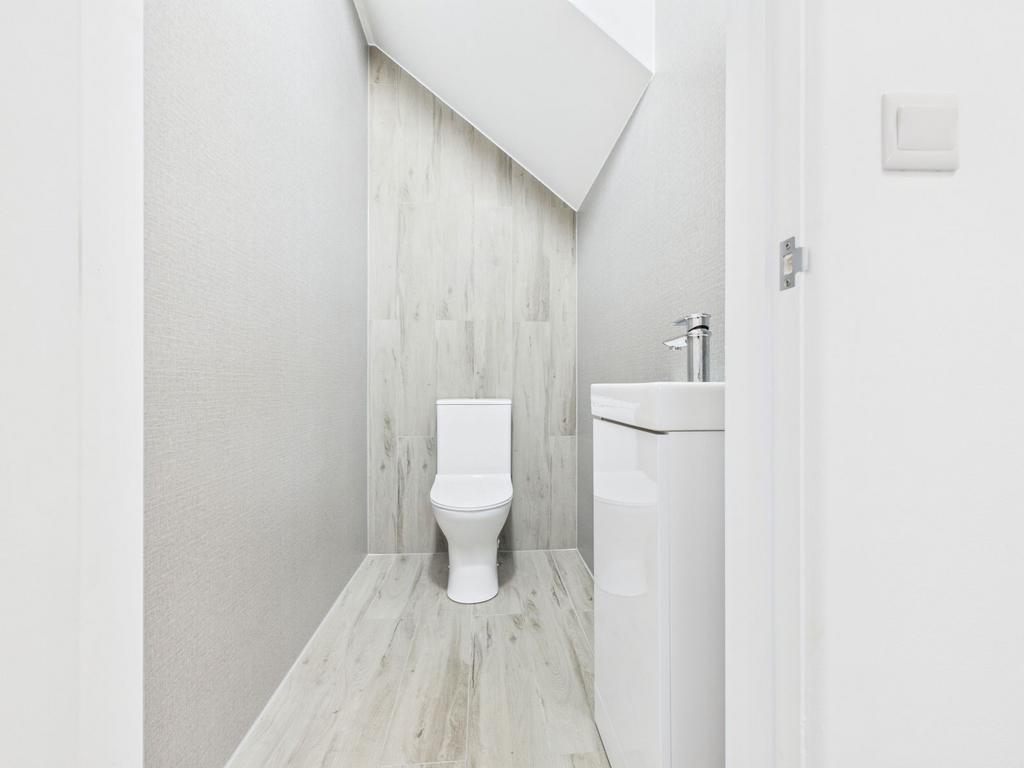 A well-appointed separate shower room double width walk-in cubicle with glass doors and shower fitment with a large drench head, body spray and cascade tap. Quality vanity unit with recessed wash basin with cascade tap over, matching close couple WC with dual flush. The walls are tastefully decorated with a mix of stone effect tiling and wall panels. Feature double glazed sash window and white ladder radiator.