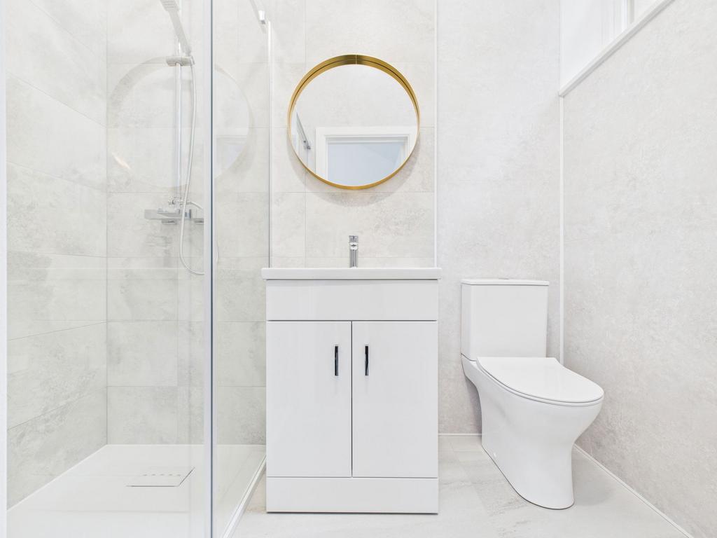 A contemporary white suite with close couple W/C, with dual flush and vanity unit with inset wash hand basin. Wood effect to floor and walls along with contrasting acrylic panelling.