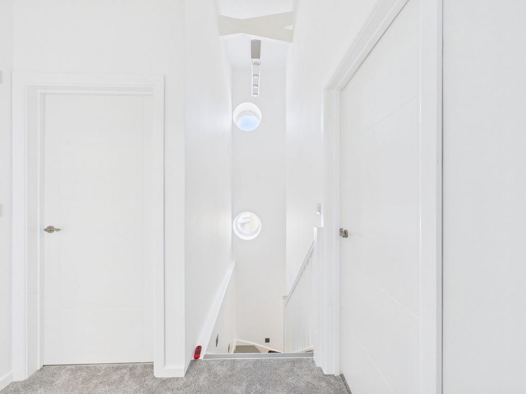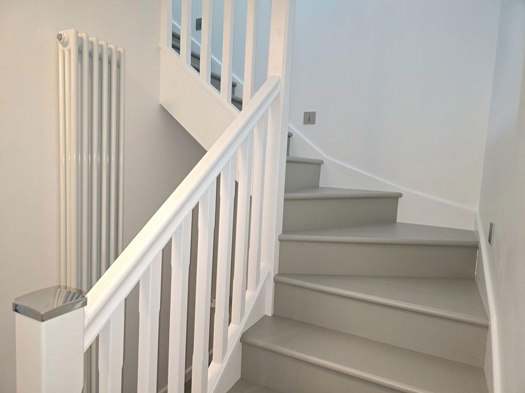 A stylish range of modern light grey high gloss units with soft close doors and white marble effect counter tops. There is a range of built in Hotpoint appliances including stainless steel gas hob with Cooke and Lewis stainless steel cooker head over, oven and microwave. Integrated white composite sink with black mixer tap over. Cupboard to accommodate a fridge freezer. Cupboard housing Viessmann gas boiler with digital controller and app operation facility. There is room in the kitchen for additional worktops or breakfast table and chairs. Wood effect flooring. Spot lights to ceiling. Stairs with sensor LED tread lights leading to the first floor landing. Within the impressive stairwell are two original double glazed porthole windows with inset mini spotlights creating a comforting glow in the darker winter nights. This is complimented by a modern remote controlled statement light fixture over the stairs with graduating light intensity and colour changing LEDS.