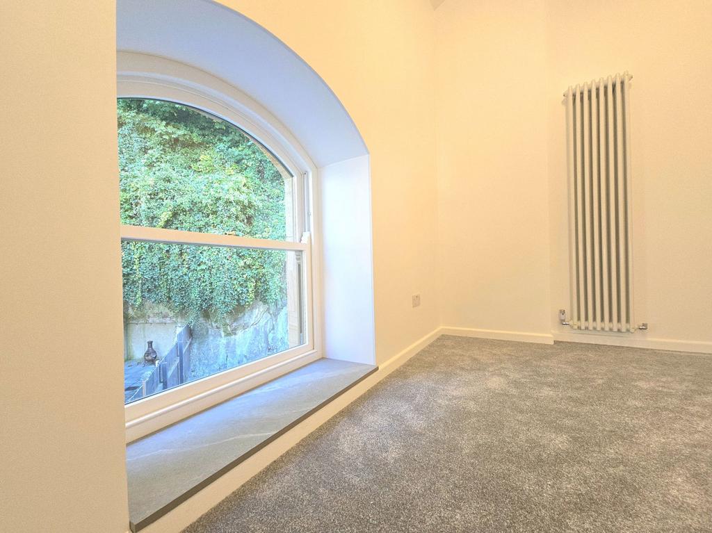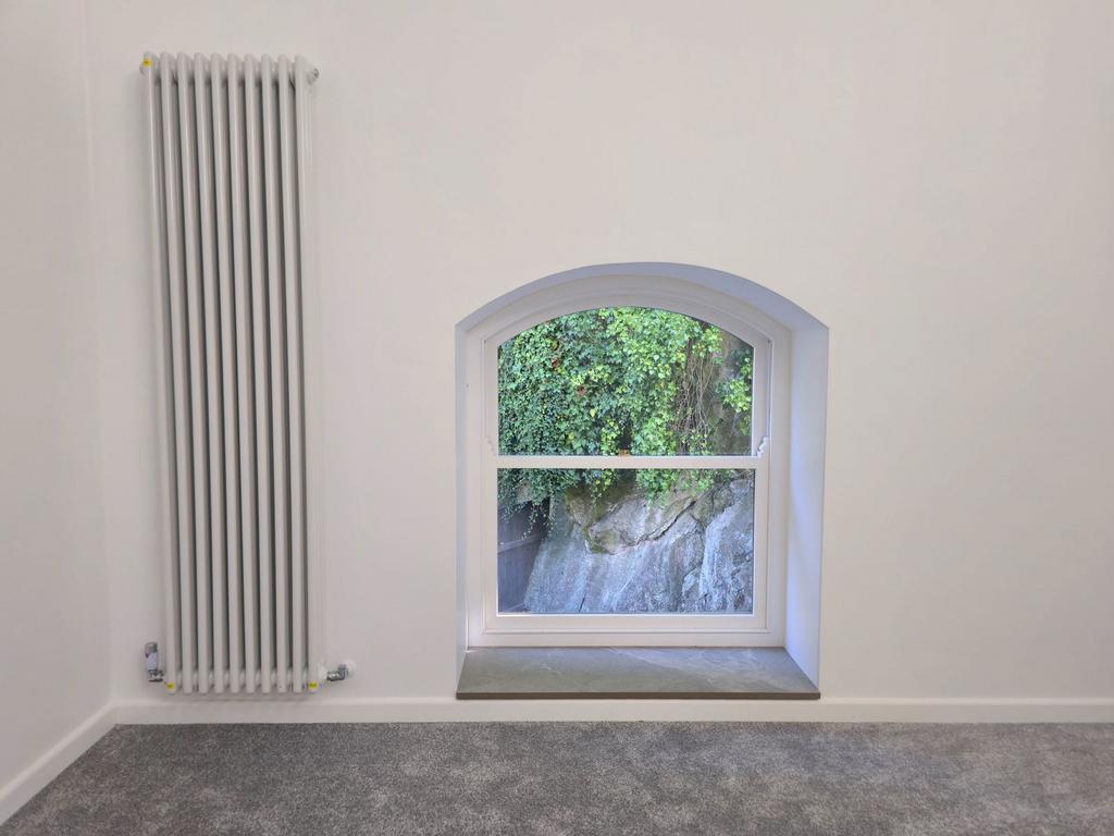 A further double room with low level double glazed porthole window and arched sash window with dressed stone cill. The ceiling is also vaulted with the original brace beam work. Modern radiator. Power points one with USB charging points.