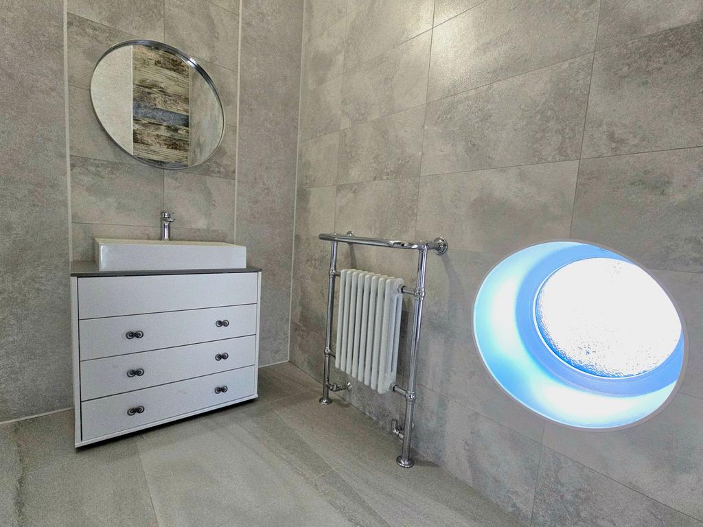 This modern contemporary bathroom is large. It measured 2.7m x 2.5m (max) and has a high beamed vaulted ceiling. There is a luxury white suite offering a shower bath with mixer tap plus mains fed shower unit and glass screen. There is also a wide vanity unit with full width surface mounted wash basin and mixer tap. Victorian style period radiator with towel rail. Again stylishly furnished with complimentary stone effect tiling and wall panels with feature 'driftwood' filing. Wood effect flooring. Two double glazed porthole windows with mini spot lights creating effect mood lighting.