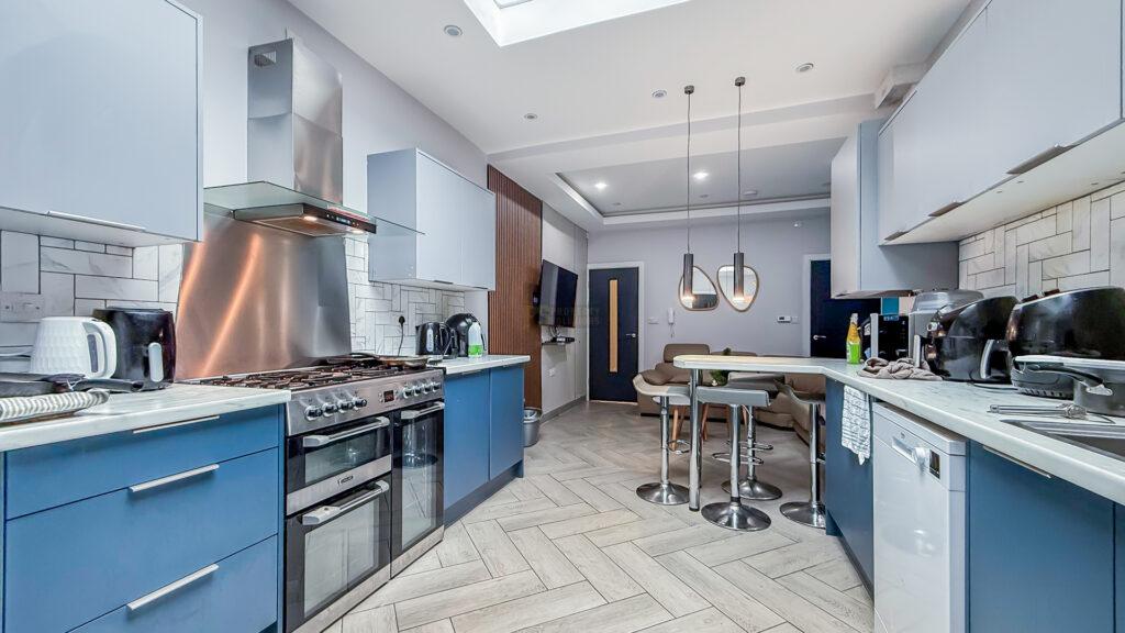 On the ground floor, students will also find an open-plan lounge and kitchen. Here, students will find the property's tumble dryer and separate washing machine, a breakfast bar, a flat-screen television, and a deep-seated sofa. This area has additionally been fitted with spotlights and a skylight, creating a perfectly well-lit environment.