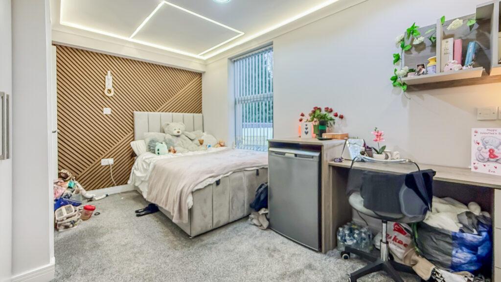 Each bedroom showcases soft carpeting, ceiling strip lighting, a personal television and a marble-tiled ensuite bathroom. Every bedroom has also been fitted with a personal fridge for added convenience, a desk area for study, a standard double bed, a chest of drawers, and a cupboard.