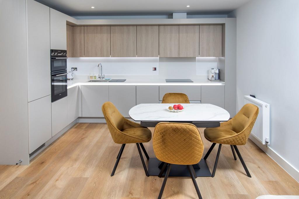 Open plan kitchen/dining/living space with a modern fitted kitchen offering wall and base level handleless units, silestone work surface and a range of integrated appliances to include a fridge/freezer, dishwasher, double oven and induction hob with extractor hood above. Patio doors leading onto the balcony.
