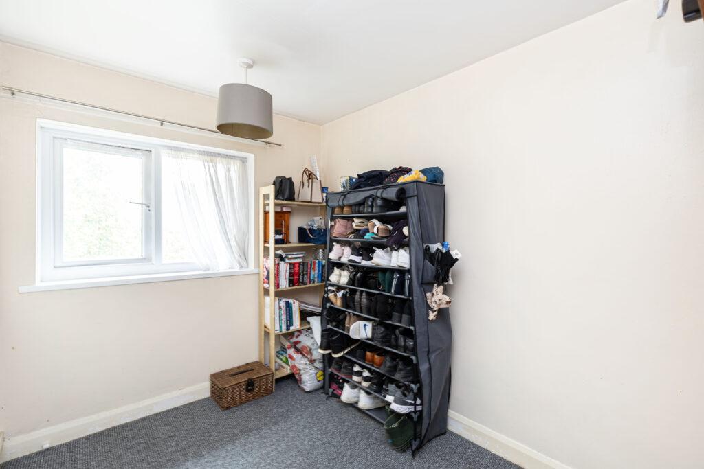 The second bedroom is positioned opposite the kitchen and overlooks the front of the property. It's a versatile space that can comfortably accommodate a double bed or serve as an office or study. The room is decorated in neutral tones with a grey carpet.