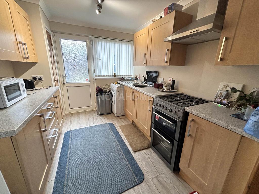 Kitchen: 9'10" x 8'5" (3.0m x 2.6m) modern fitted units, ample worktops, integrated cooker hood, and door to rear garden.