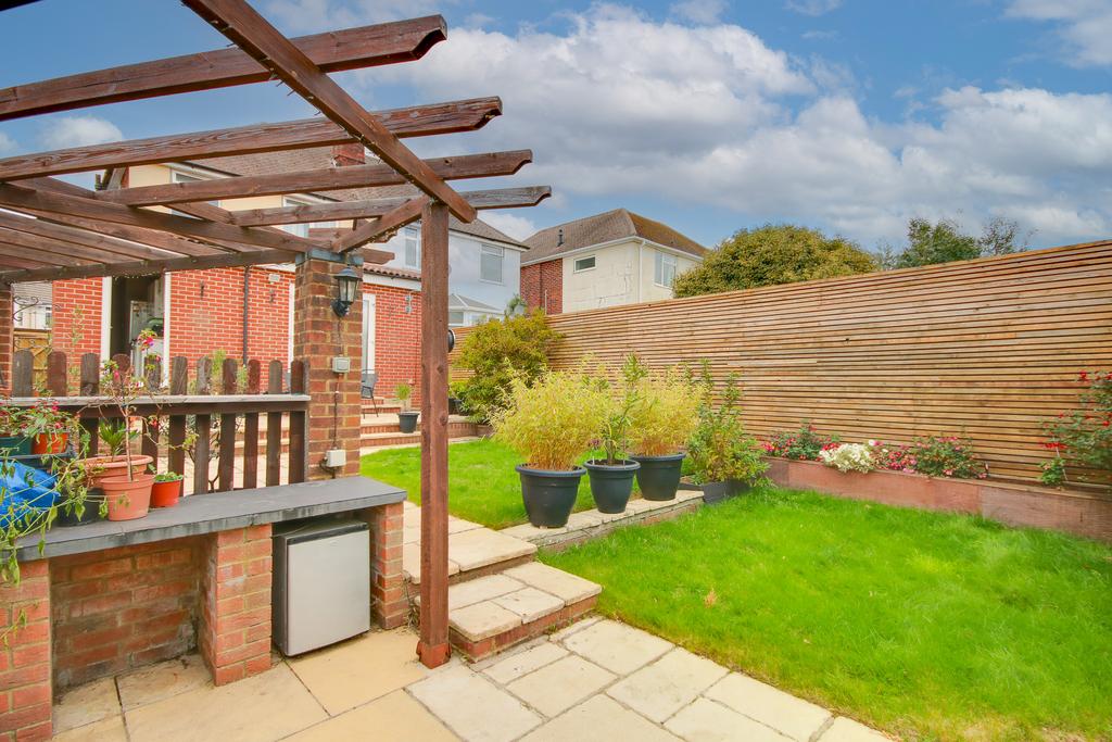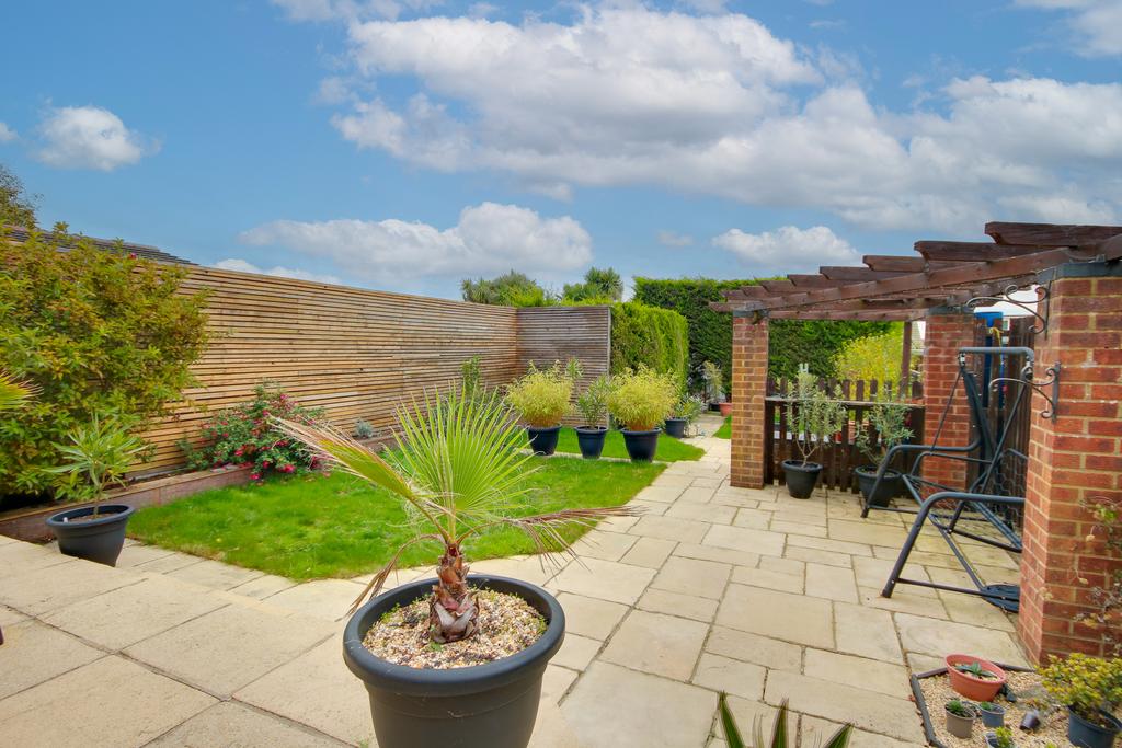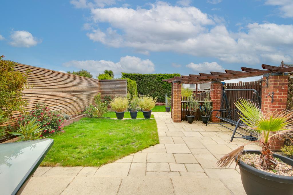 Fence enclosed rear garden, landscaped patio to lawn with shrub borders, workshop with power and light connected, green house, side access.