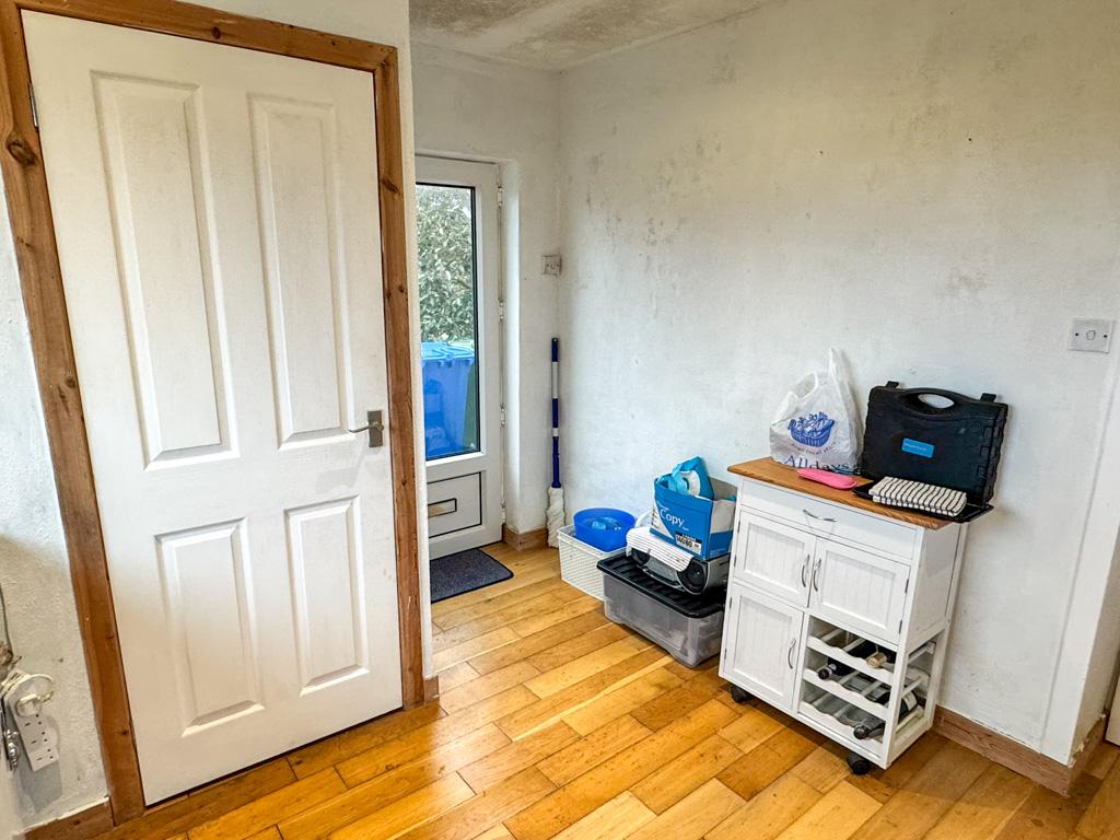 Wall and floor units. Stainless steel sink with side drainer. Electric hob with oven under. Windows to side and rear. Hardwood flooring. Large fitted storage cupboard housing central heating boiler. UPVC door to rear.