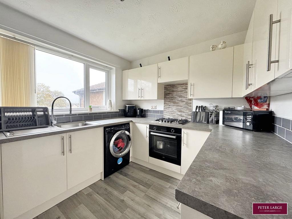 Having a range of cream fronted base cupboards and drawers with worktop surface over, matching wall units, inset single drainer stainless steel sink with mixer tap over, part tiled walls, power points, built-in electric oven and four ring gas fired hob, plumbing installed for an automatic washing machine, laminate flooring and a double glazed window overlooking the front elevation.
