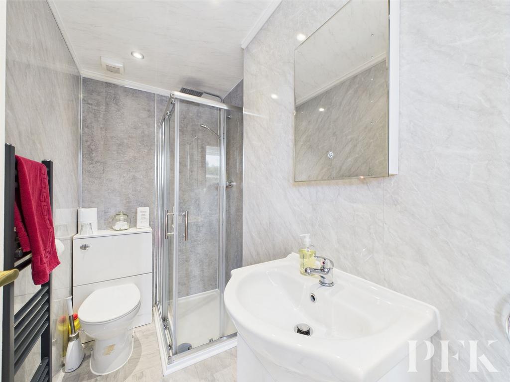 WC, wash hand basin set in vanity unit, shower cubicle with mains shower and a heated towel rail.