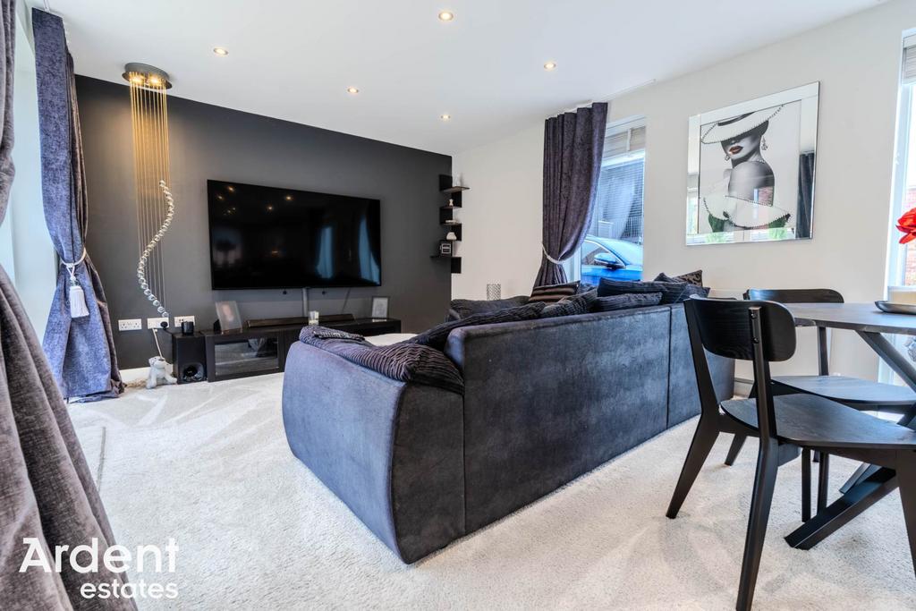 The ground floor features a welcoming entrance hall with cloakroom and utility cupboard, leading into a bright and spacious open plan kitchen/dining room fitted with sleek units and integrated appliances. The adjoining lounge area enjoys direct access to the rear garden through wide french doors, creating a light filled living space ideal for both relaxing and entertaining.