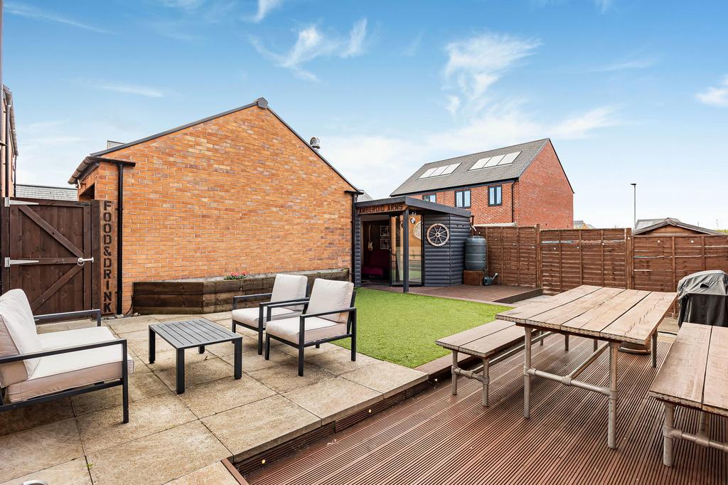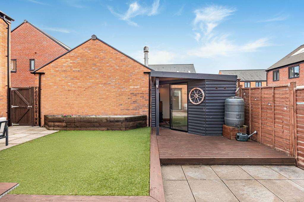 To the front, there is driveway parking and a single garage, while the rear garden has been thoughtfully landscaped to provide a stylish and private outdoor retreat. Two patio areas offer ideal spots for relaxation or entertaining, and a versatile outbuilding adds to the appeal that is currently used as a bar area but equally suited as a home office, studio, or gym.
