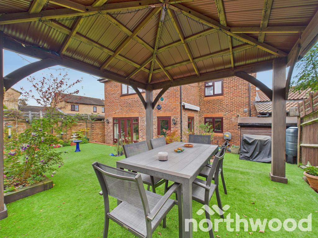 At the heart of the garden, the beautifully crafted timber gazebo offers a striking focal point. With its pitched roof and warm toned panelling, it’s more than a shelter it’s an invitation to linger. Whether hosting summer gatherings or enjoying a quiet morning coffee, this is outdoor living at its finest.