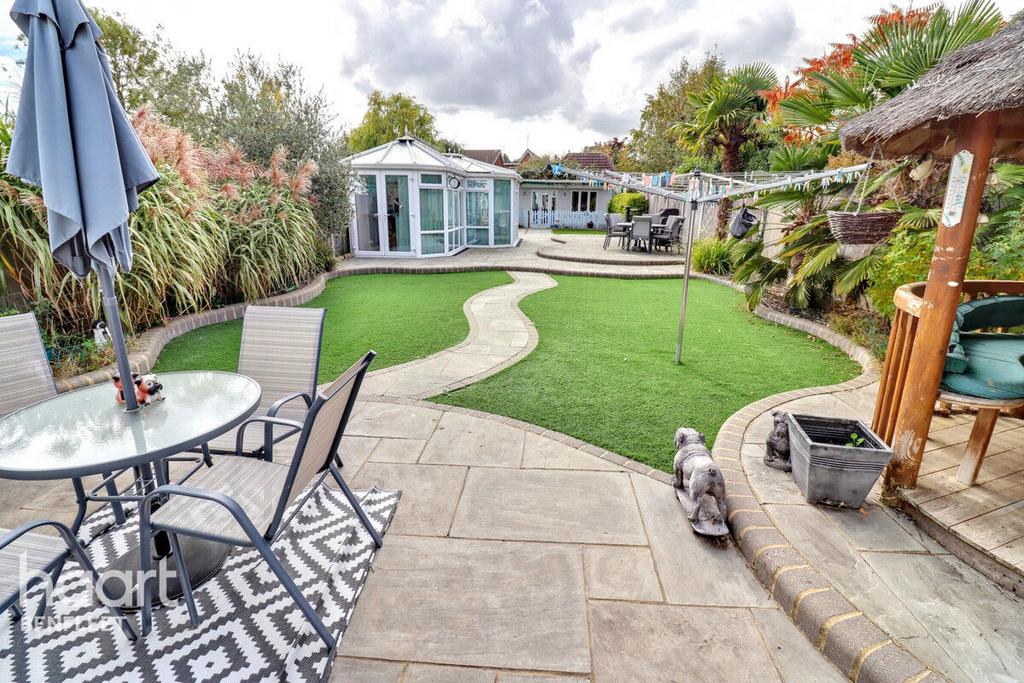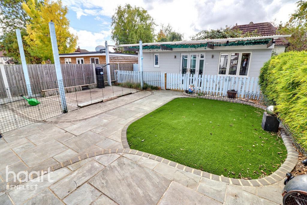 A generous patio leads from the house, with side access around to the front. Further back sits a glazed, conservatory‑style bar/outbuilding — perfect for entertaining. At the far end is a self‑contained annex with shower, kitchen and living space. The rest of the garden is laid to artificial grass for low‑maintenance.