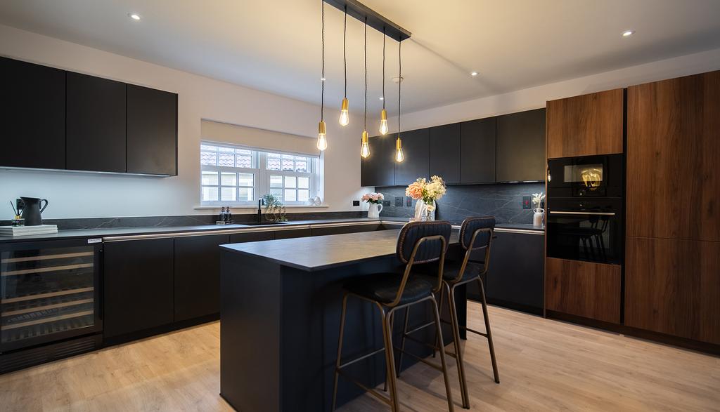 At the heart of the home lies the stunning open-plan kitchen, dining, and family area. This space is thoughtfully designed for both everyday living and social gatherings, boasting sleek modern appliances, ample storage, and stylish finishes. The room is bathed in natural light, thanks to the expansive bi-fold doors that open directly onto the beautifully landscaped rear garden, effortlessly merging indoor and outdoor living.