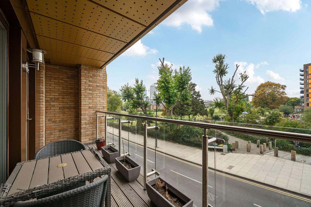 The property comprises two generous bedrooms, a modern bathroom, and a standout feature — a large private balcony with sweeping views over Bartlett Park and Limehouse Cut canal, perfect for morning coffees or evening relaxation. Secure underground bike storage is also included.