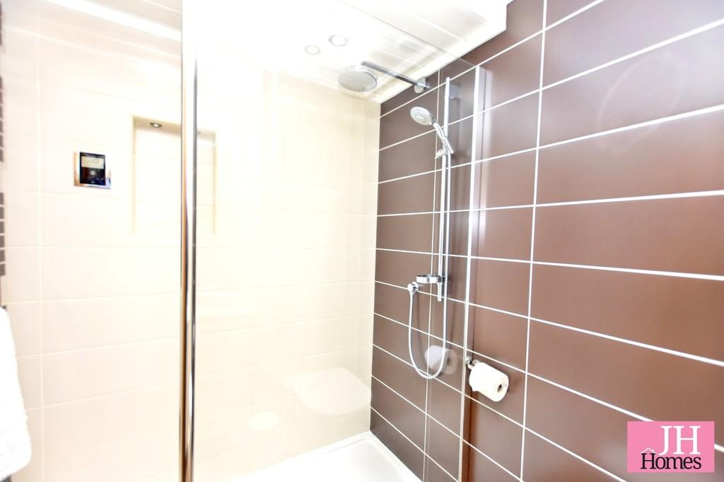SHOWER ROOM Three piece suite comprising of glazed shower panel with fixed rain head and flexi-track spray, recessed soap/shampoo shelf, inset lights and control for shower. Vanity unit with curved moulded worksurface, wash hand basin with mixer tap and drawers/cupboard under. Shaver point with mirror above, WC with concealed cistern and storage cupboards above. Tiling to walls, ladder style radiator and panelling to ceiling with LED lights and extractor fan.