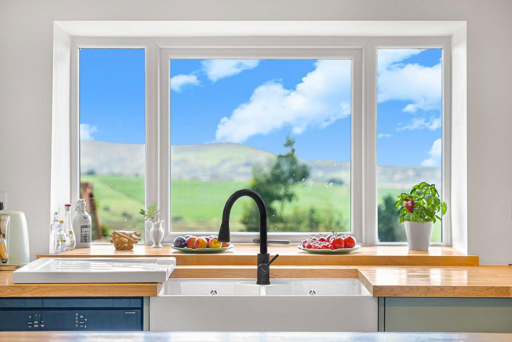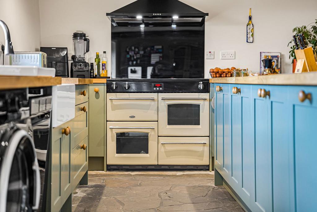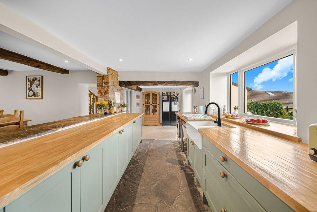 The kitchen features shaker-style base units with solid wood worktops, a Belfast sink, electric range cooker, and space for a washing machine and dishwasher, Incredible views can be enjoyed through the window beyond the sink. UPVC double-glazed french doors lead to the rear garden, and the kitchen also retains an original stone-flagged floor.
