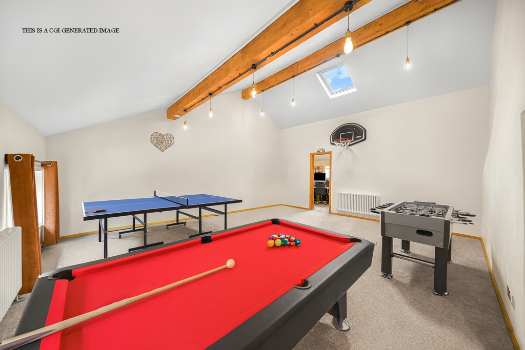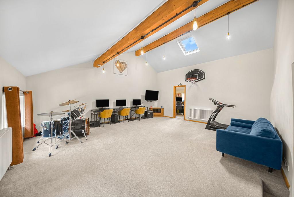 Bedroom Five / Games Room: A versatile space with vaulted ceiling, wooden beams, two UPVC double-glazed windows, two central heating radiators, and access to the home office.