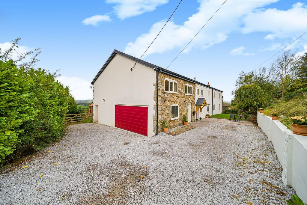 The front garden includes an oak-framed porch, flagged entrance with stone detailing, trees, and a dry stone wall. There is ample off-road parking, access to the rear garden via side gates, and access to the double garage/workshop.