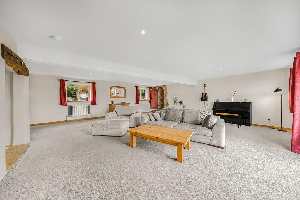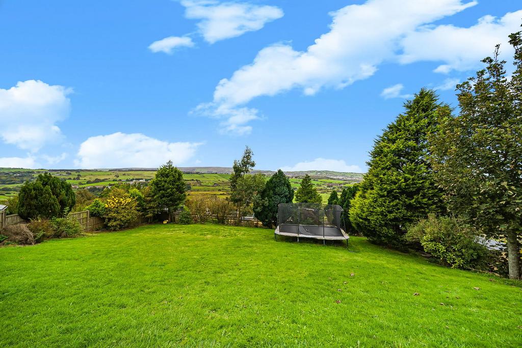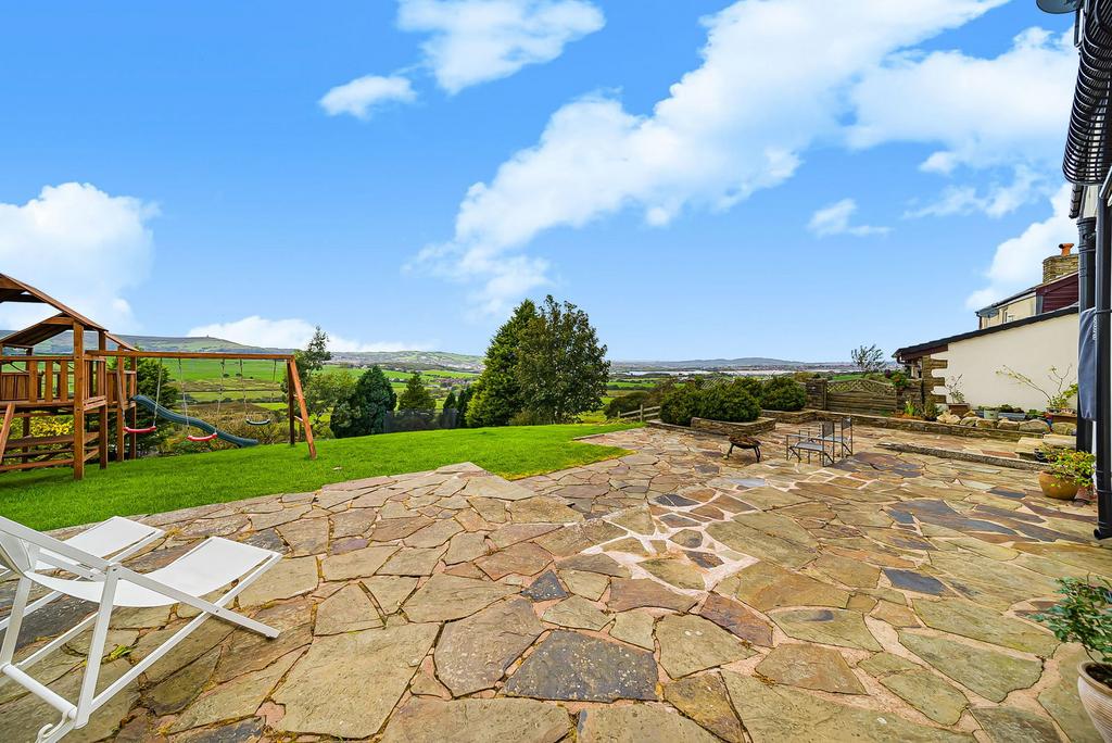 The property enjoys a large private rear garden offering peace and tranquillity. Features include a flagged patio, children’s climbing frame, lawn, and endless countryside views.