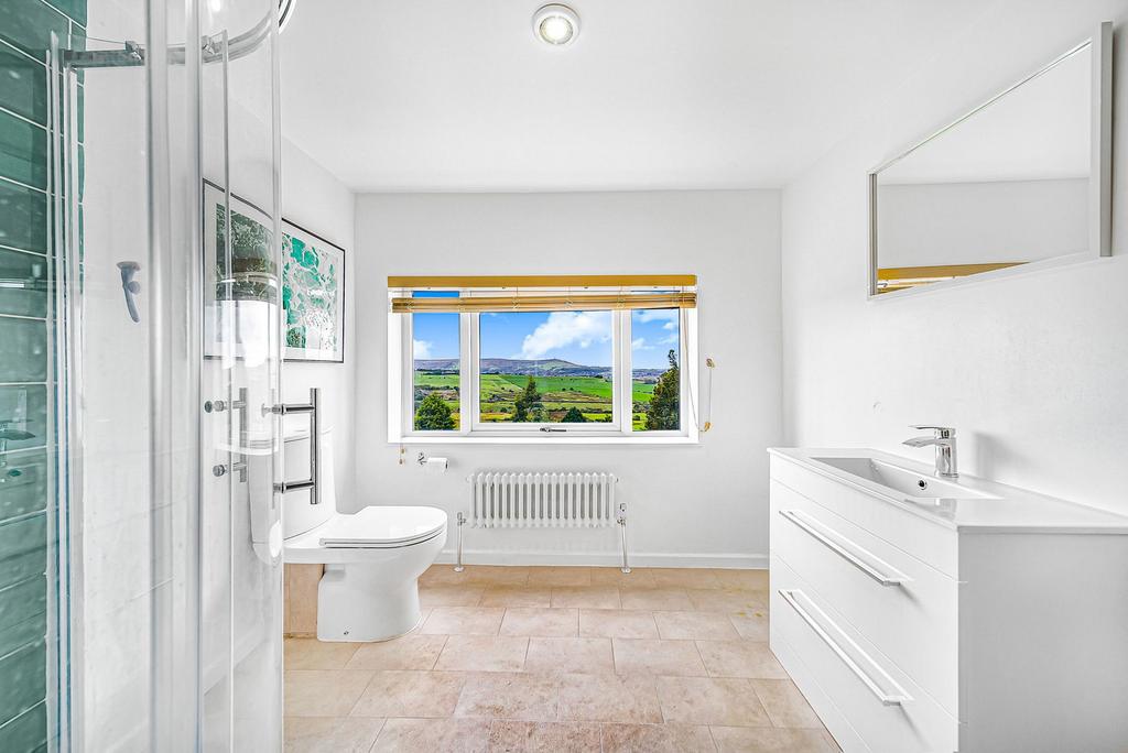 En-suite: Corner shower, vanity sink, low-level WC, towel rail, part-tiled.