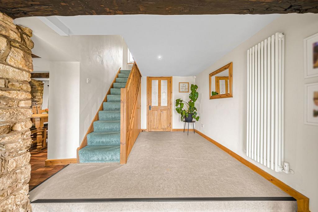 A composite stable door opens into a porch, leading into a spacious entrance hallway with a vinyl floor, central heating radiator, and access to the kitchen and dining area, as well as stairs to the first floor.