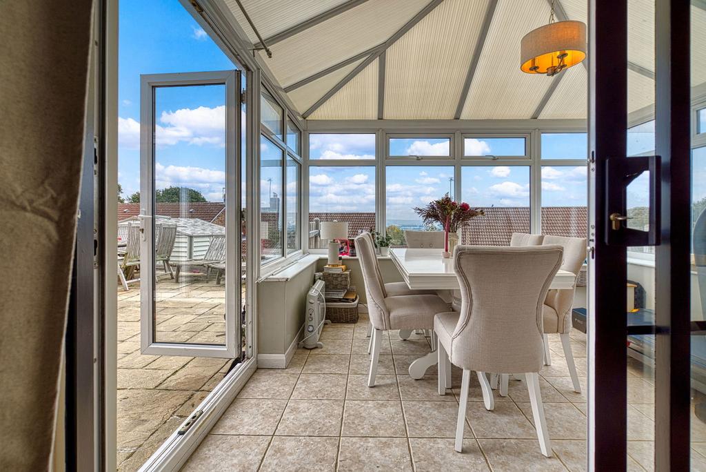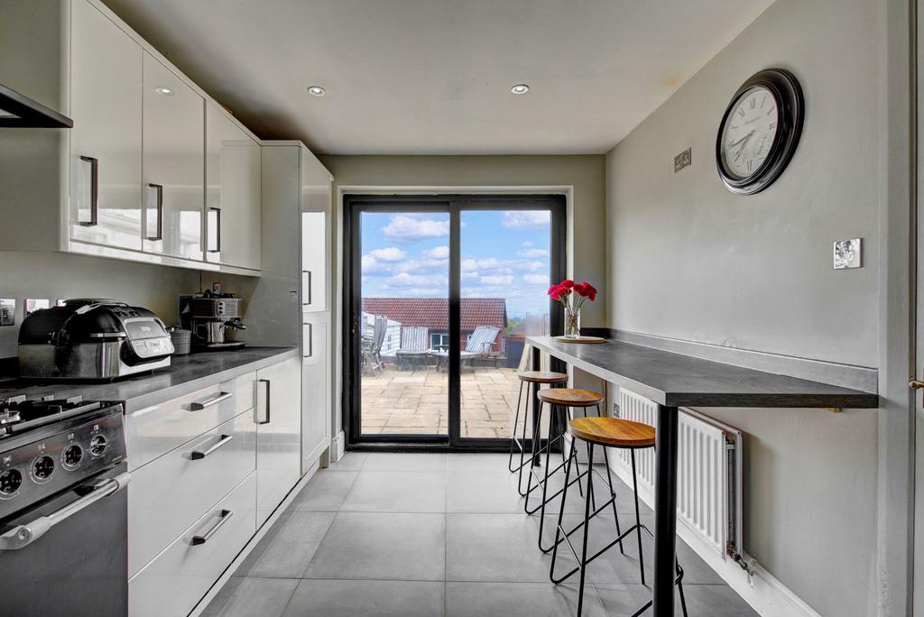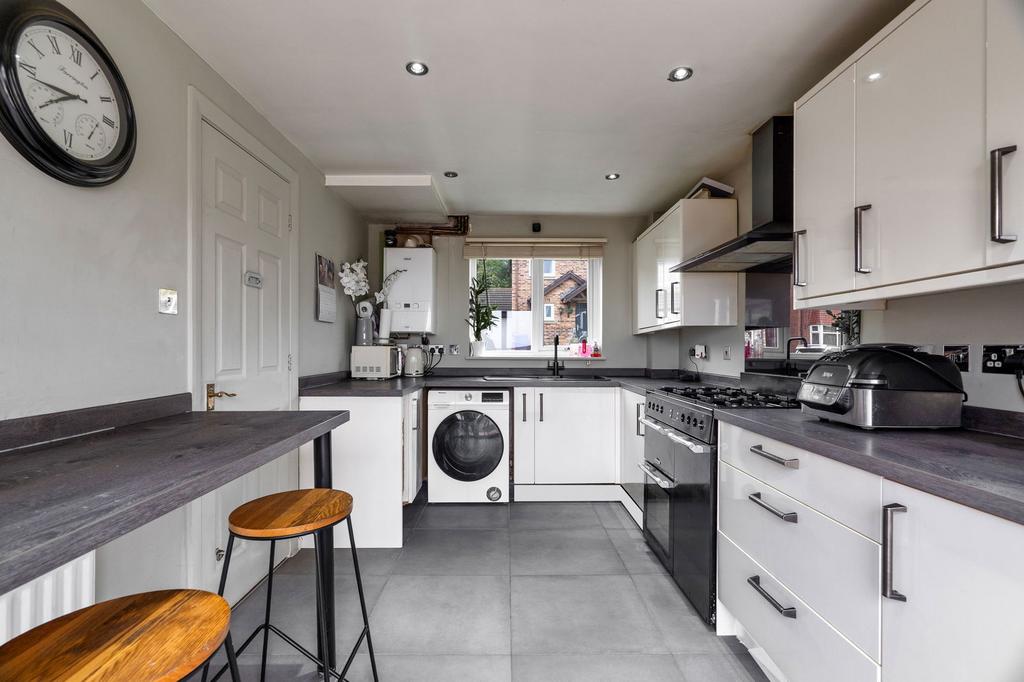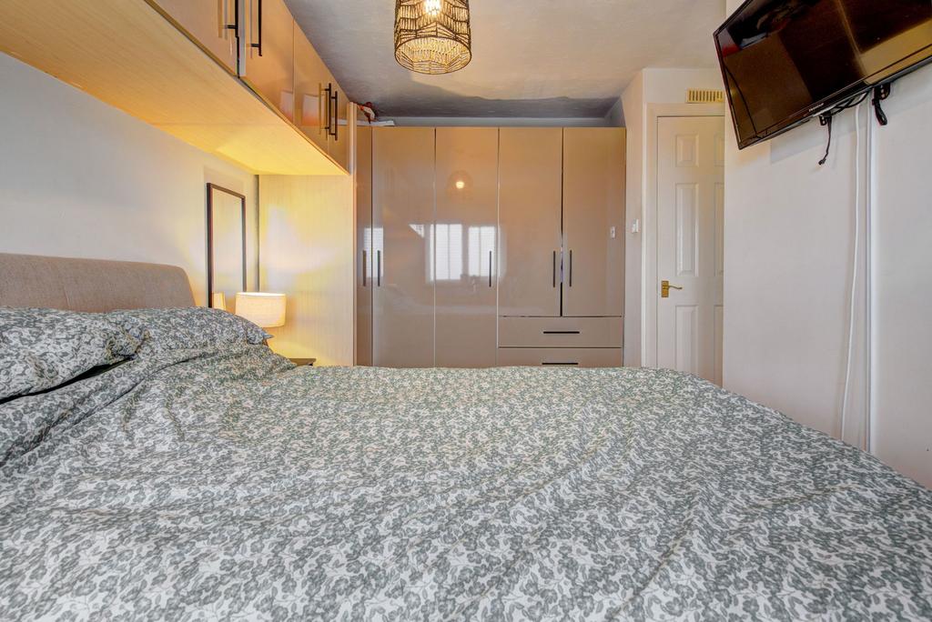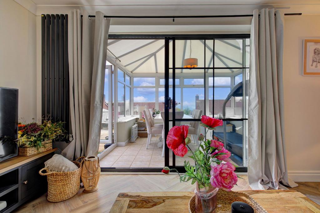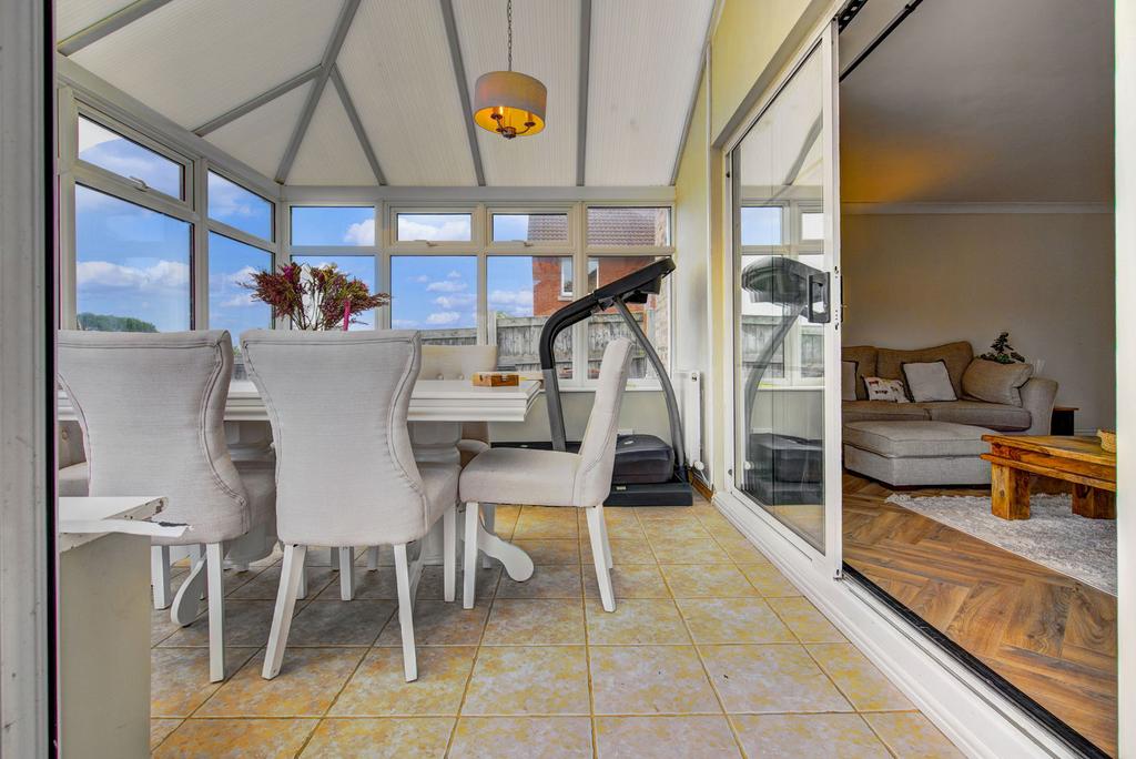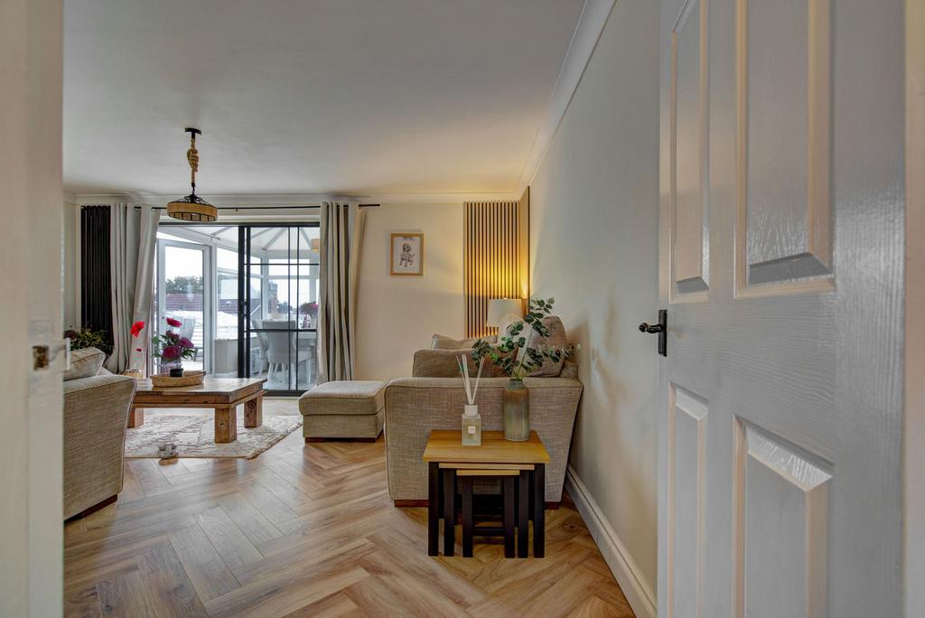 Upon entering, you are greeted a hallway with a downstairs toilet to the side leading into a bright and airy modern living area, designed for comfort and functionality. The open layout seamlessly connects to a contemporary kitchen, equipped with modern appliances and ample cabinetry, inviting culinary exploration and social gatherings. The lounge has sliding doors leading to the spacious conservatory with French Doors that lead onto the patio area.