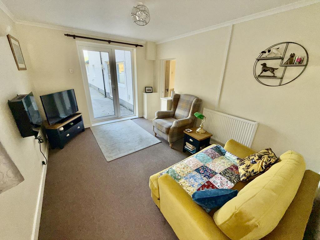 ‘Hamlet’ Multifuel stove Set in a pointed brick fireplace extending to TV and ornamental shelving, double-radiator, two double glazed windows to front and enclosed staircase elevating to the first-floor accommodation.