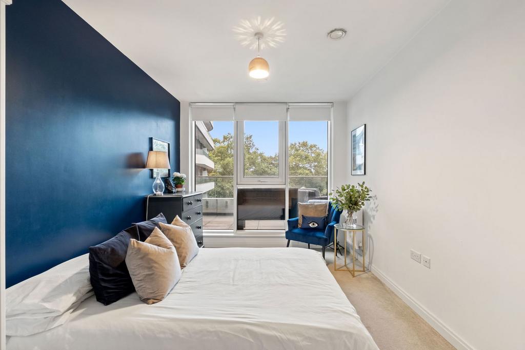 The apartment features a large open plan reception room with floor-to-ceiling windows, creating a seamless connection between the living, dining and kitchen areas. The sleek kitchen is fitted with high-quality integrated appliances and finished in a contemporary style, ideal for entertaining or relaxed everyday living. The generous dining area flows effortlessly onto a spacious private balcony that enjoys a peaceful outlook over Battersea Park, providing an ideal setting for morning coffee or evening drinks.
