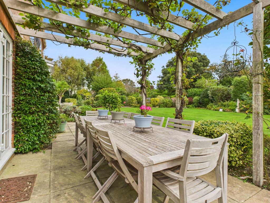 Stepping inside, you are immediately greeted by a welcoming reception hall with a feature staircase and views through to the reading/ day room. The ground floor flows effortlessly, with a selection of beautifully proportioned rooms ideally suited to both family living and entertaining. The main reception room enjoys garden views from two aspects and connects via glazed doors to a patio with a pergola for dining, creating an elegant and sociable layout flooded with natural light.