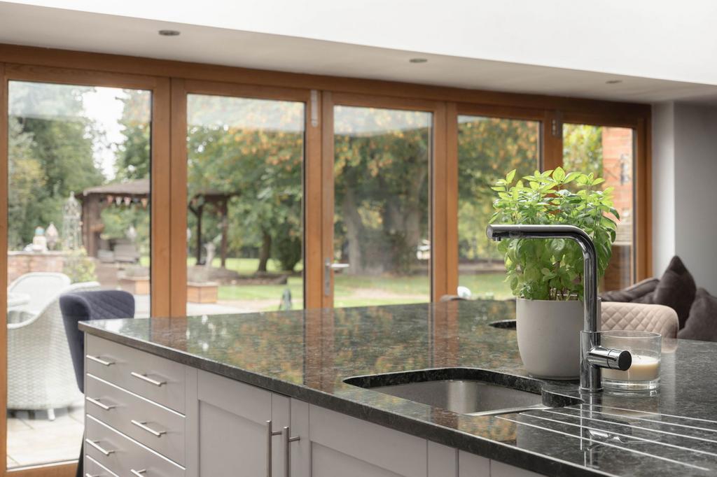 At the heart of the house lies a capacious kitchen and family room, formed from a striking rear extension that contrasts beautifully with the original fabric of the house. An expansive atrium rooflight and bifold doors draw light deep into the space and frame long views of the garden. The traditional shaker kitchen centres around a large granite-topped island, with Corian worktops and a suite of modern appliances ensuring practicality meets elegance. A wood-burning stove anchors the adjoining family area, creating a space as inviting in winter as it is open and airy in summer. This generous room leads directly into the dining room, while a separate utility keeps everyday life neatly out of view.