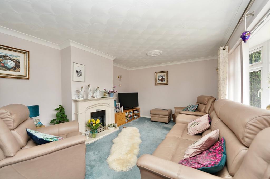A light double aspect room with UPVC bow window to front aspect and UPVC window to side aspect, wall light points, TV point, telephone point, central feature natural stone fireplace with inset Living Flame fire, coving to ceiling.