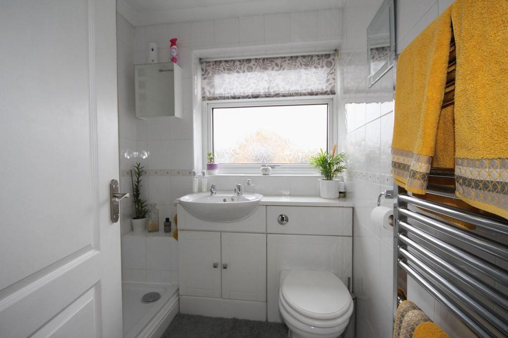Shower Room: Obscure window to rear elevation, walk in shower, vanity wash hand basin, WC, tiled flooring and splashbacks, ladder style radiator.