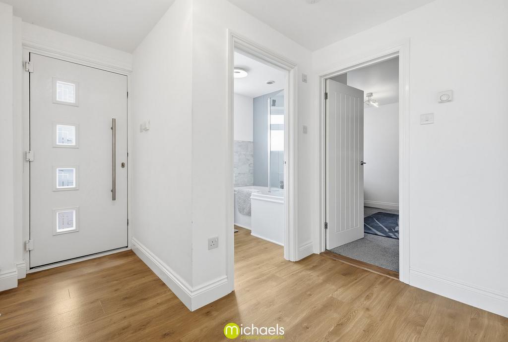 Composite front door, radiator, loft access, (the loft is boarded, insulated, with ladder and houses the boiler) and storage cupboard doors leading to: