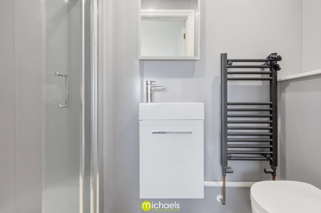 WC, towel radiator, wall mounted vanity and shower encloser.
