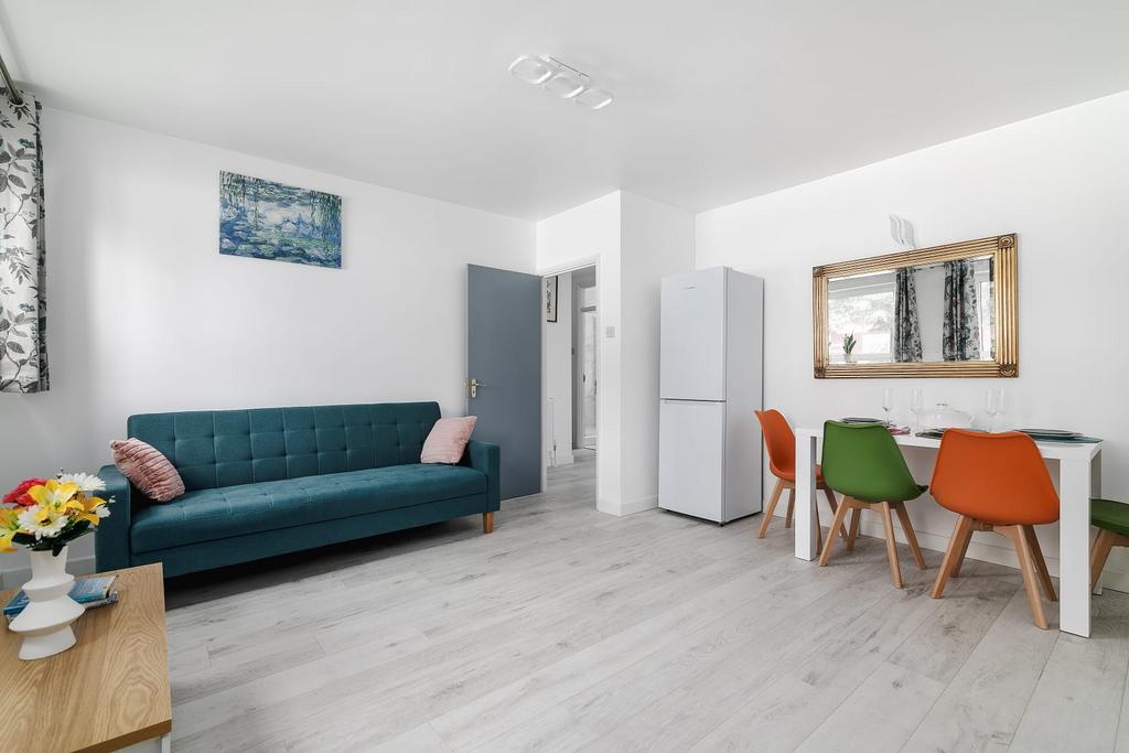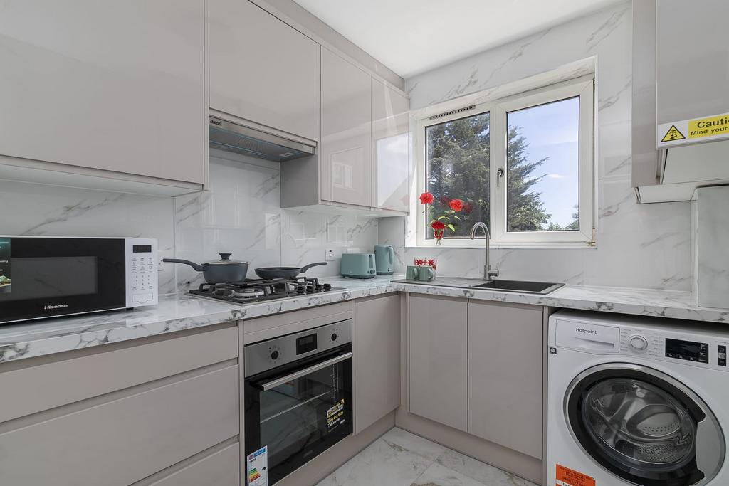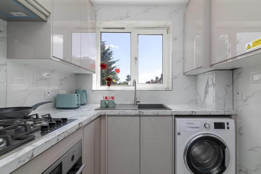 The flat features a spacious open-plan living and dining area, enhanced by large windows that flood the space with natural light. The modern fitted kitchen is equipped with contemporary appliances, ample storage, and sleek worktops—perfect for both everyday use and entertaining guests.
