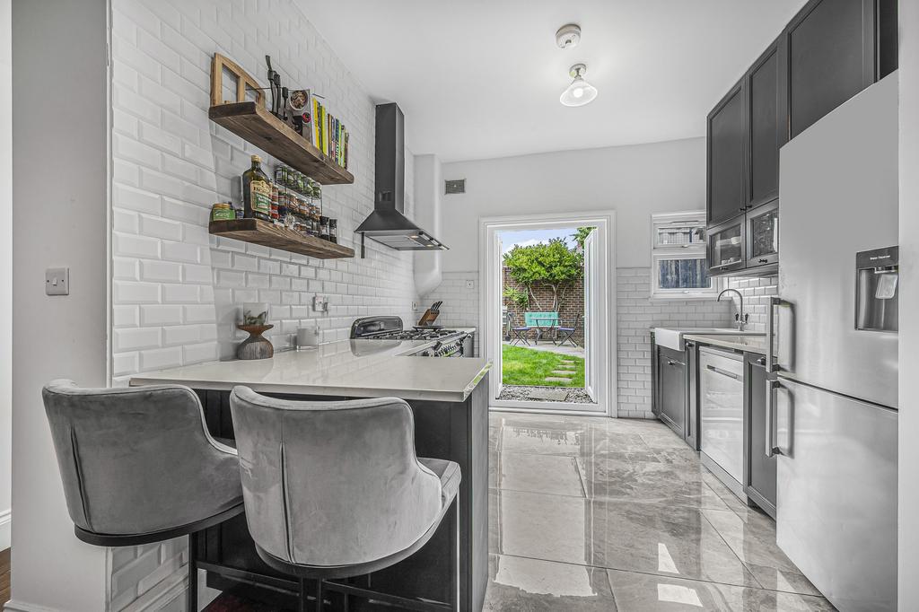 The ground floor has been tastefully extended with a side infill extension, creating an impressive living and entertaining space. The home features a welcoming reception room with elegant period details and a dedicated dining area, perfect for family gatherings and entertaining guests. The modern kitchen is finished to a high standard, offering ample storage, integrated appliances, and a bright, open feel. Large glass doors lead directly onto a beautifully landscaped private garden, creating a seamless indoor–outdoor flow ideal for summer living. A recently added downstairs WC enhances practicality for everyday use.