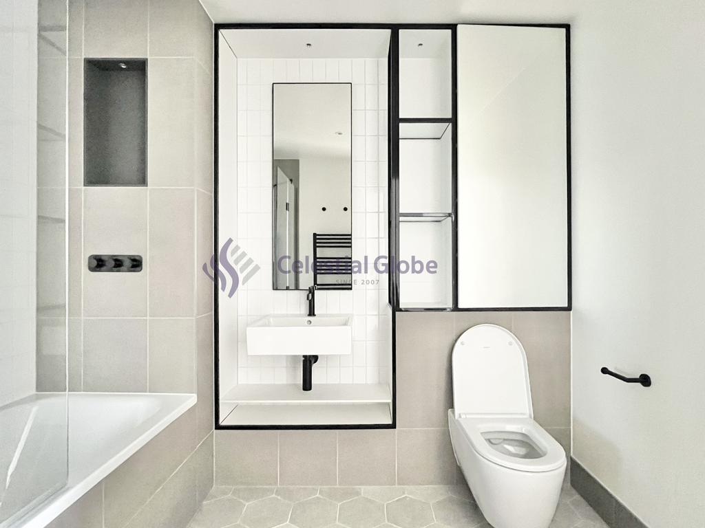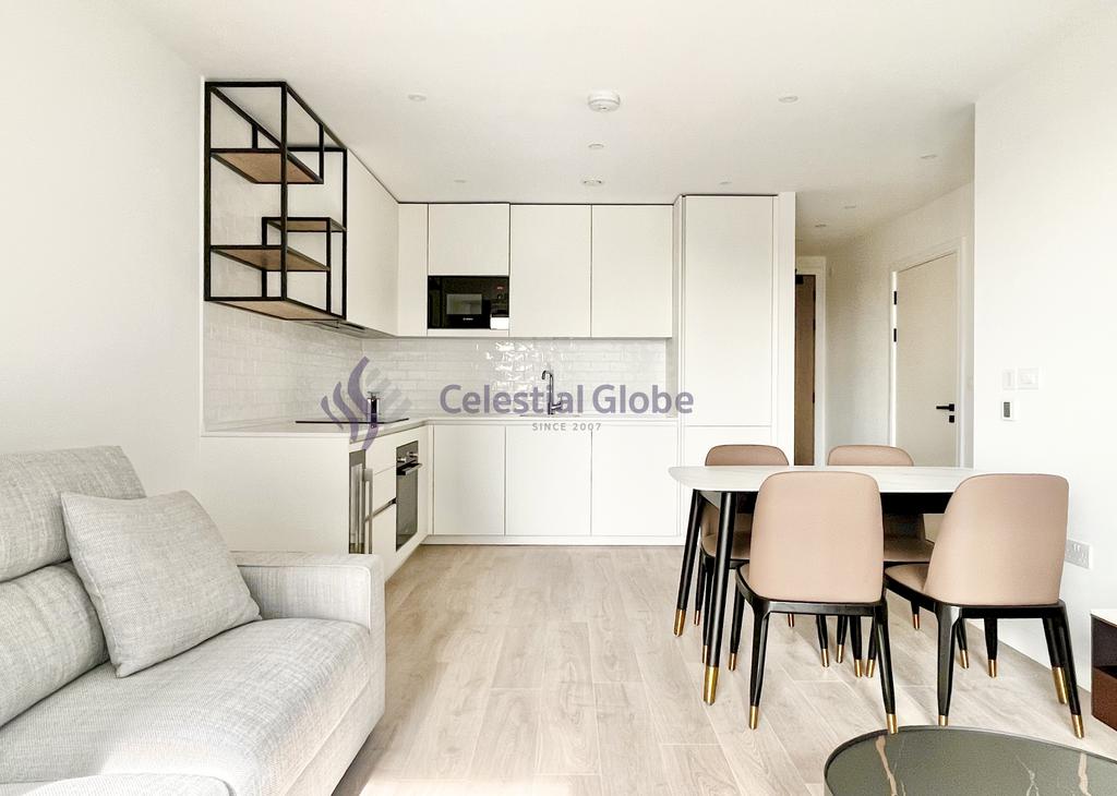 The property features a spacious open-plan living and dining area with large windows that fill the space with natural light, leading out to a private balcony ideal for relaxation or entertaining. The fully fitted kitchen is finished to a high standard, complete with integrated appliances and sleek cabinetry. The bedroom offers ample space with built-in storage, while the modern bathroom is beautifully designed with premium fittings and a full-size bathtub.