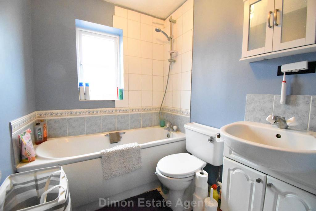 White suite of panelled bath, low level W.C., vanity hand basin, tiled splashbacks, laminate flooring, PVCu double glazed window, extractor fan.