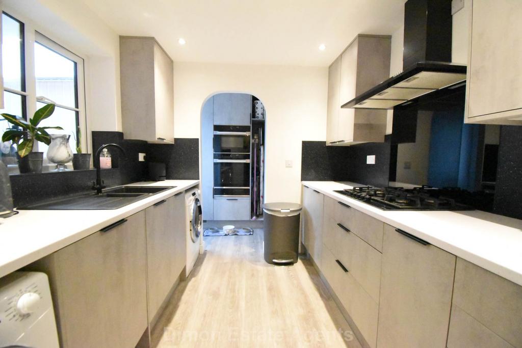 14'2 (4.32m) narrowing to 9'0 (2.74m) x8'0 (2.44m) narrowing to 5/6(1.68m), 1 1/2 bowl composite sink unit, grey fronted wall and base units with worksurface over, 5 ring gas hob with cooker extractor canopy over, plumbing for washing machine, space for dryer, integrated dishwasher, laminate flooring, PVCu double glazed window, double oven, integrated fridge/freezer, PVCu double glazed back door.