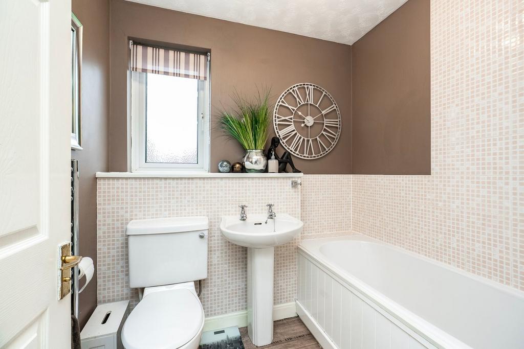 Being fitted with a three piece suite comprising bath with mixer tap and hand held shower attachment, pedestal wash hand basin, WC, heated towel rail, ceiling light point, extractor fan, obscure glazed window to side elevation.