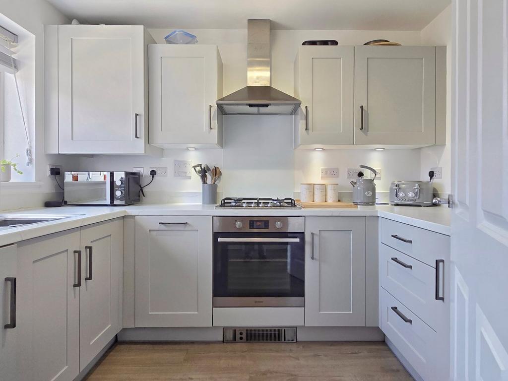 9' 6" x 7' 2" (2.90m x 2.18m) A range of base and wall mounted units with work surfaces over, stainless steel sink and drainer with mixer tap, double glazed window to the front, combi-boiler, integrated appliances to include - oven, gas hob and extractor, dishwasher, fridge freezer and washing machine.
