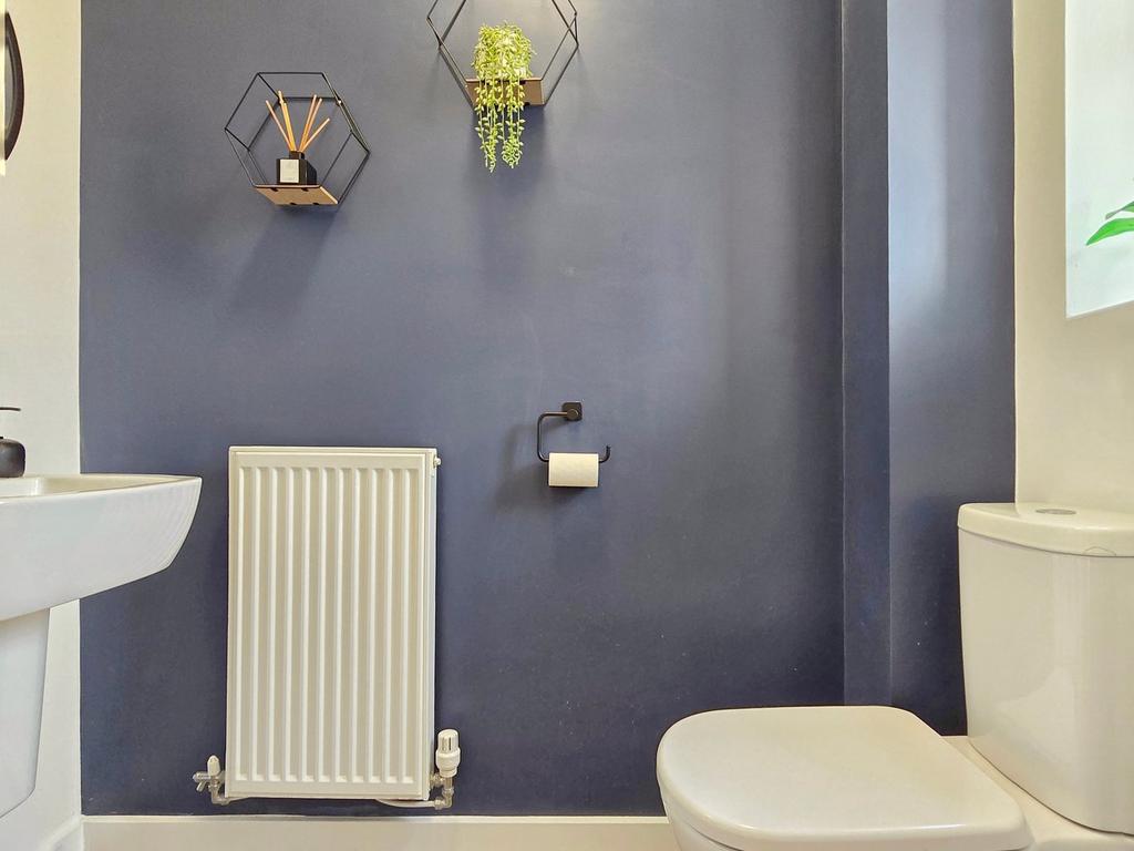 A suite comprising of a low level WC, wash hand basin, double glazed window to the front, radiator.
