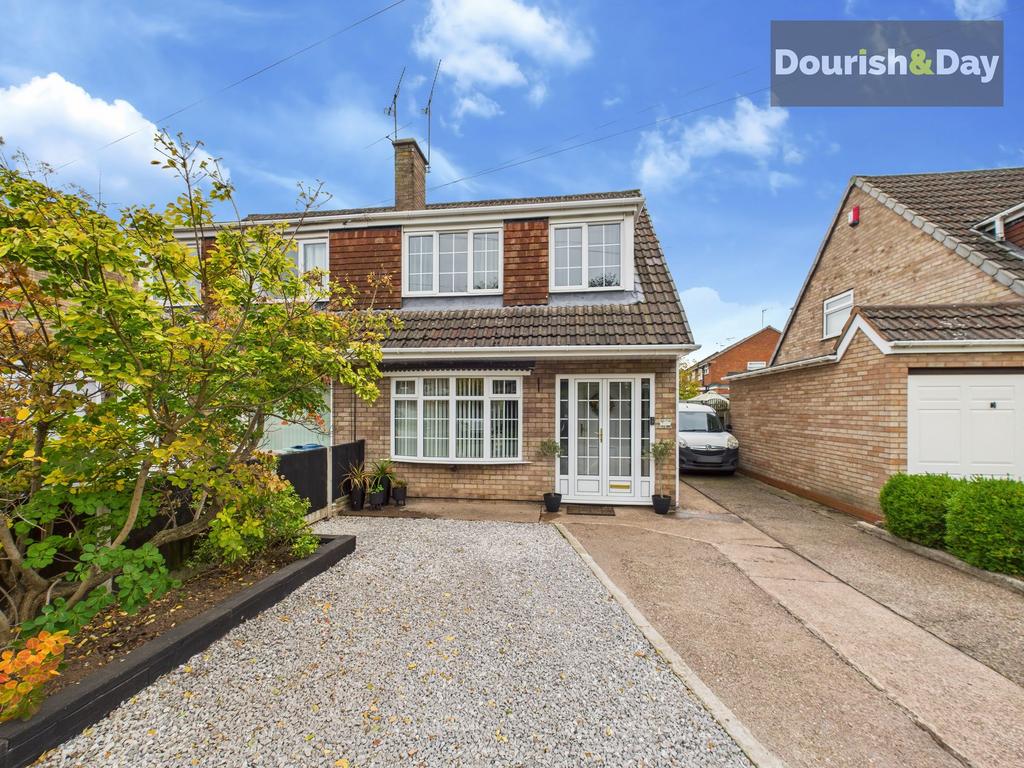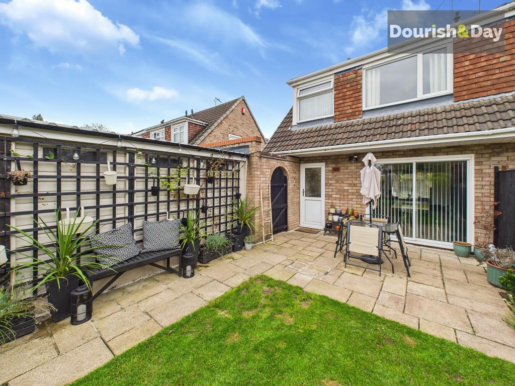 To the front, the property enjoys driveway parking for up to three cars, including one on a pebbled section, as well as a single garage running alongside the garden. The spacious driveway with a flower border and small trees enhances the kerb appeal, while the porch opens into a welcoming entrance hall featuring under-stairs storage and access to both the lounge/diner and kitchen.