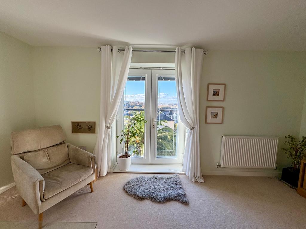 BEDROOM 1 enjoys a French door with side window opening to a Juliette balcony overlooking the attractive communal gardens towards Dartmoor in the distance. EN-SUITE with corner shower cubicle with tiled walls, wash basin, WC, wood effect flooring and extractor fan. BEDROOM 2 enjoys similar views as bedroom one. BATHROOM with suite of panelled bath with shower attachment taps, wash basin and WC. Wood effect flooring and extractor fan.