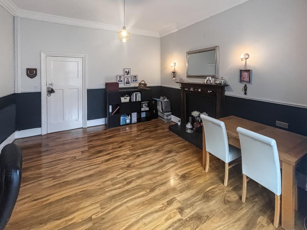 Bay-fronted with fireplace, cornicing, dado panelling and wood-effect flooring.